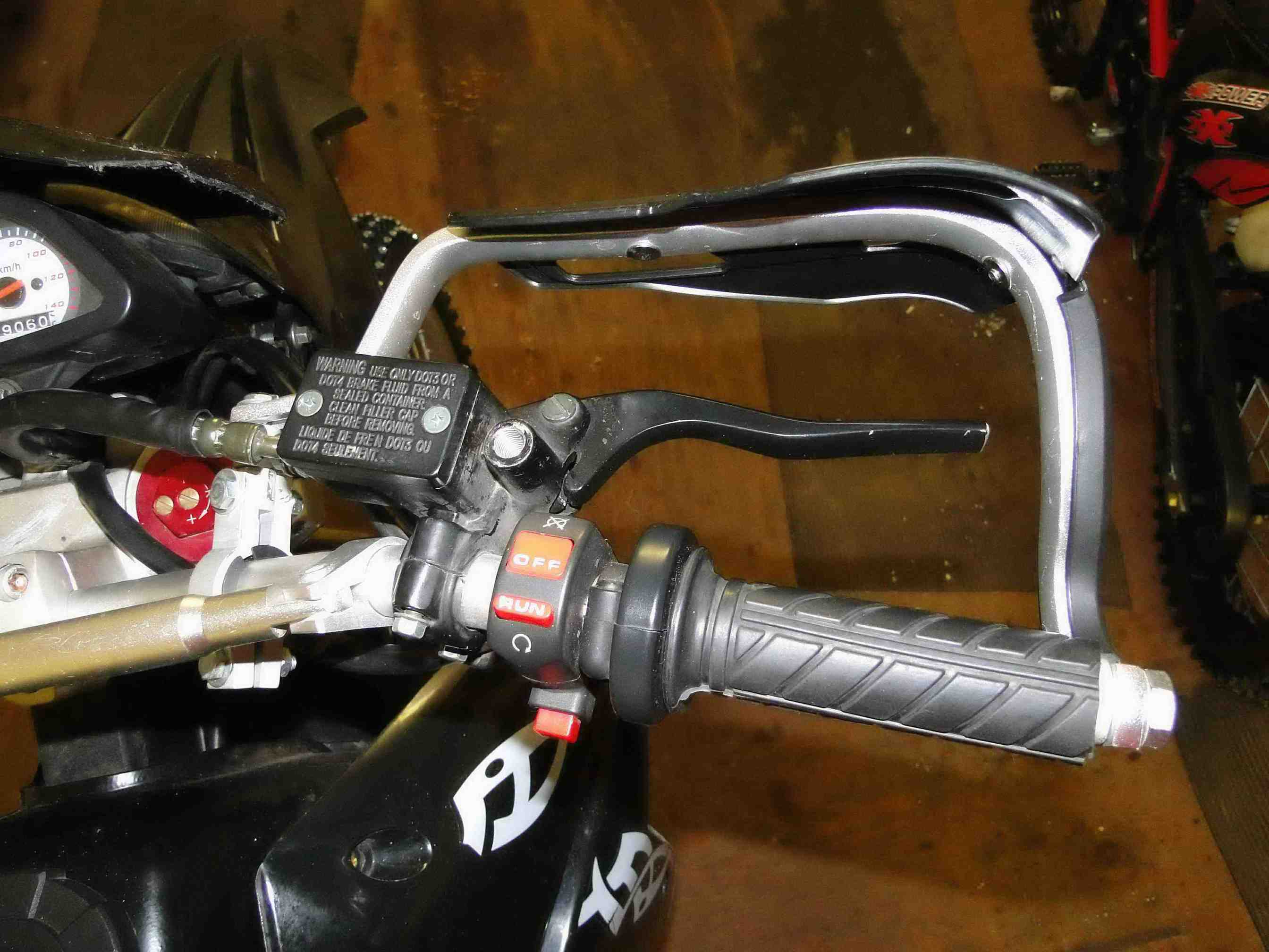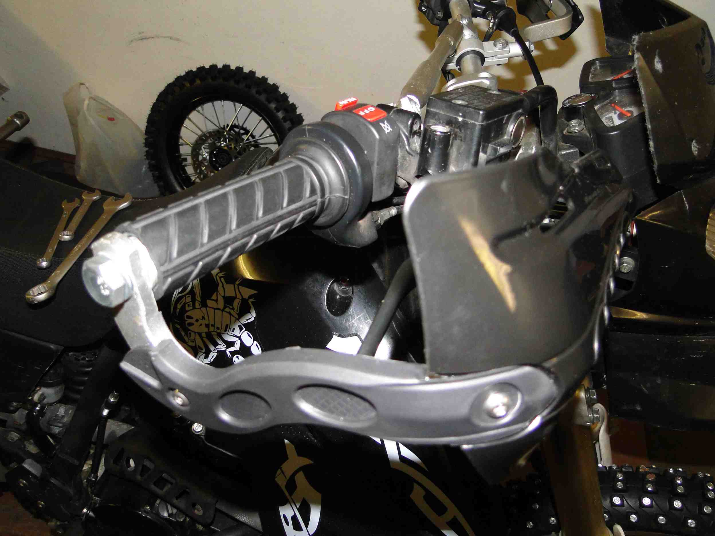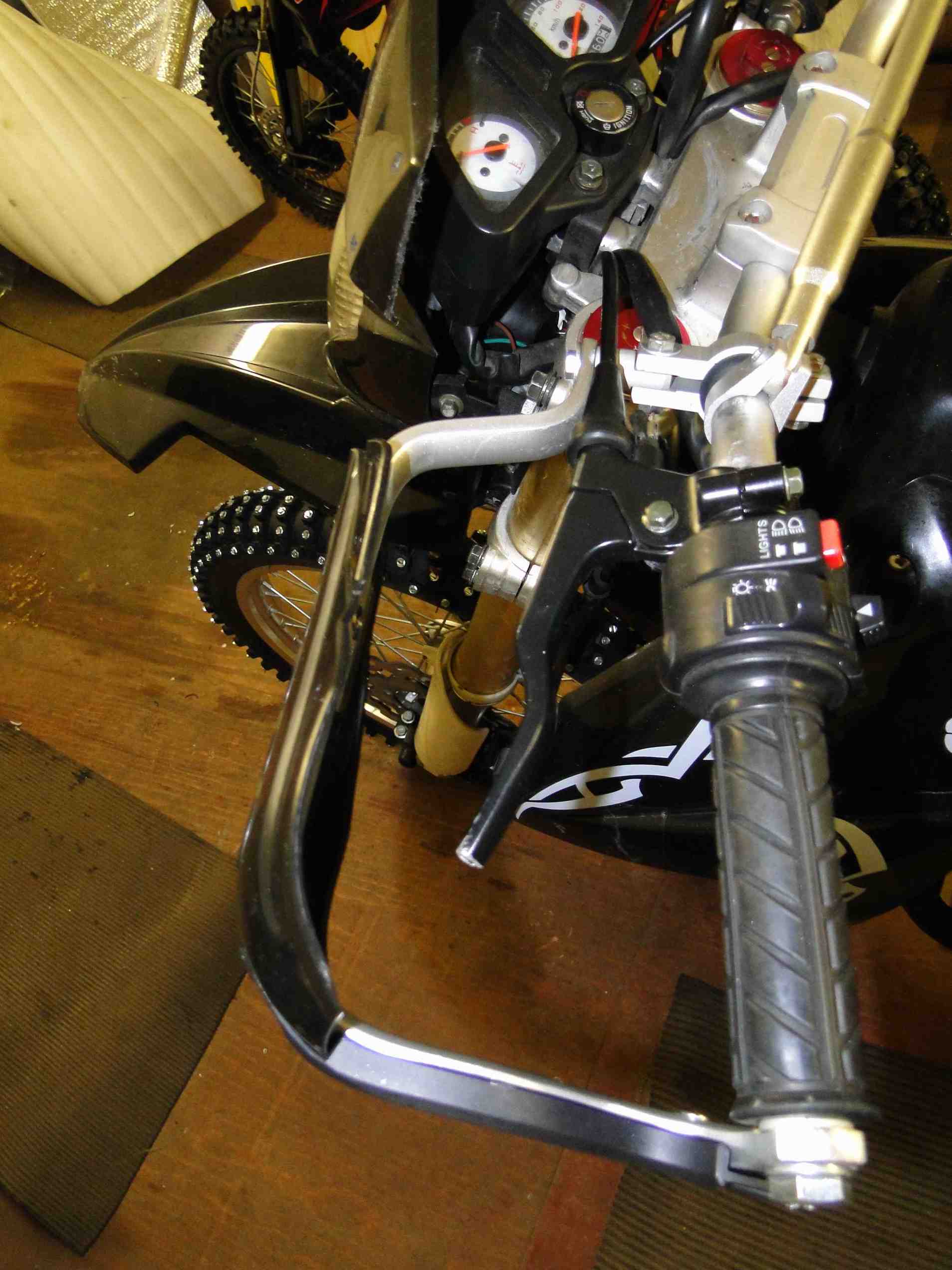 Родной рычаг сцепления снял и пока не пилил. Вместо него поставил рычаг от Ирбис ТТР-250, который в свое время был немного обломан. Можно было бы его оставить и на постоянку, но на нем нет крепления для зеркала.